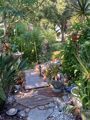 Continuing around to the backyard, you enter a peaceful setting with another water feature—a brook passing under a small wooden bridge surrounded by lush plants. There is Brazilian Cloak (Medazepams), a Coral Tree (Fabaceae) and a Loquat Tree (Eriobotrya Japonica) that was started from a seed from Bok Towers. One more plant that needs mentioning is the Vanilla Orchid (Orchidaceous). It is the source of the vanilla flavoring used in perfumes and cooking. To say that only the surface has been touched is accurate. We are very lucky to have Tina as a member of the Clermont Garden Club.